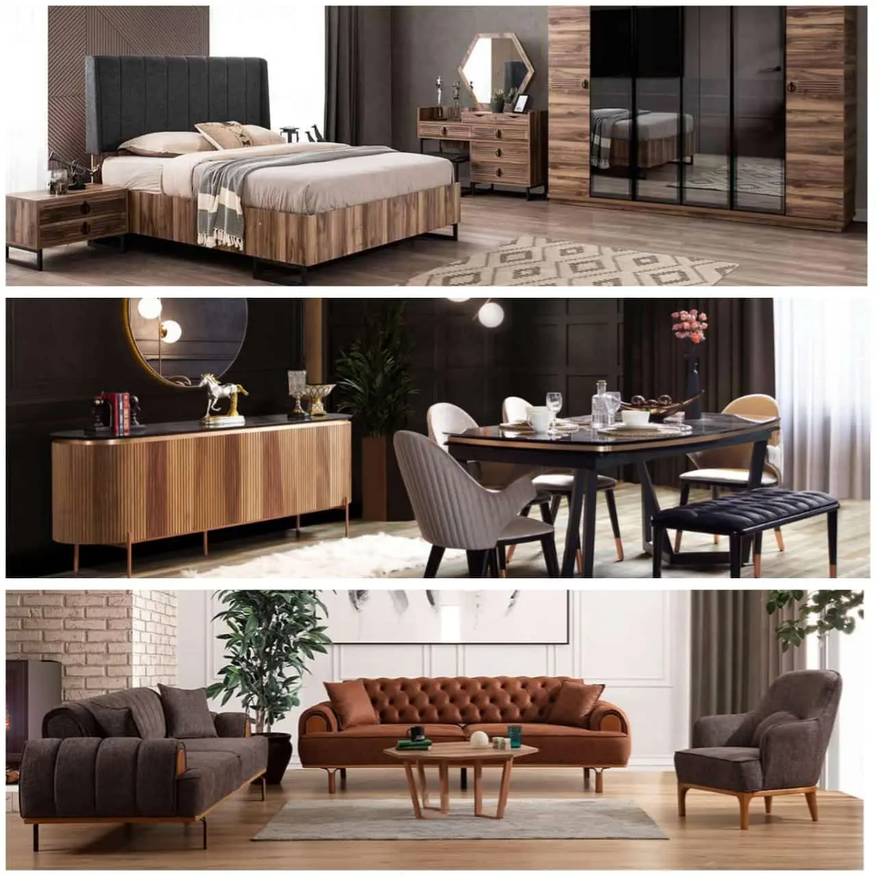 Tesla Ceviz Düğün Paketi Yatak Odası Takımı,Yemek Odası Takımı ve 3 3 1 Koltuk Takımından oluşmaktadır.
